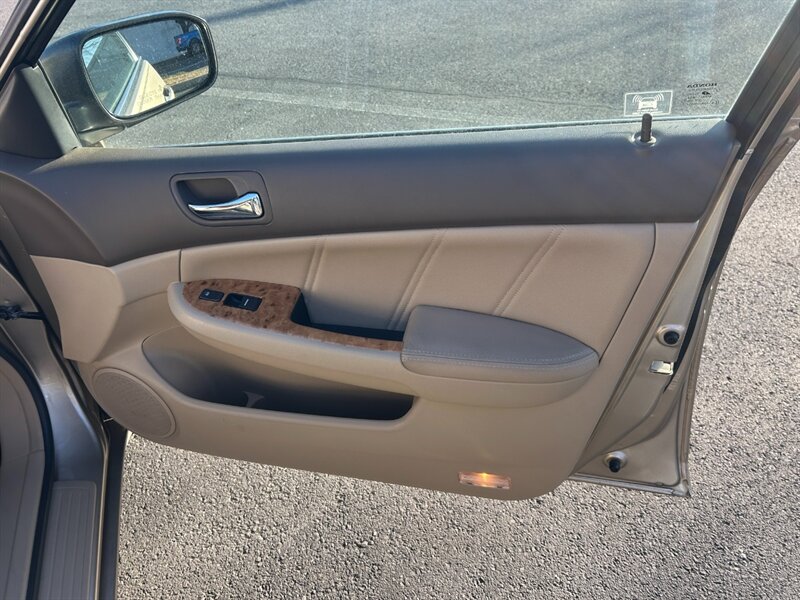 Just Arrived 2005 Honda Accord EX V-6 finished in Desert Mist Metallic with an Ivory interior. Powered by a 3.0L NA V6 SOHC 24-valve engine, factory equipment includes leather-trimmed seating with heated front seats and an 8-way power driver’s seat, power windows, door locks and mirrors with remote keyless entry, tilt steering with cruise control and steering-wheel audio controls, a power sunroof, alloy wheels, anti-lock brakes and front/side airbags, plus an AM/FM/CD audio system and full power accessories. This vehicle has excellent mileage — under 81,000 miles (averaging less than 4,000 miles per year) — and returns about 19 MPG city and 28 MPG highway. It is in excellent overall condition, has a clean CARFAX, and shows one owner.