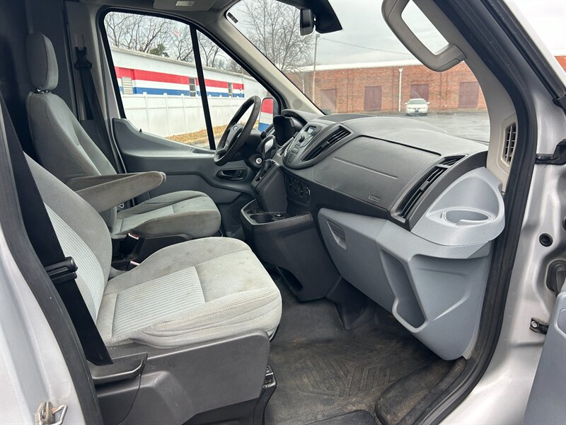2015 Ford Transit 250 with a 3.5L V6 engine, silver exterior and pewter interior. Factory-equipped with air conditioning, cloth front seating, power windows and door locks with remote keyless entry, tilt steering and cruise control, AM/FM stereo with CD/auxiliary input (USB-equipped audio), halogen headlights and steel wheels. Standard safety and chassis features include multiple airbags (front and side-curtain), anti-lock brakes (ABS), electronic stability control and traction control; practical utility features include a sliding side cargo door and rear swing-out doors with a durable cargo area. Clean CARFAX; mileage is below 104,000 miles, averaging under 9,000 miles per year.