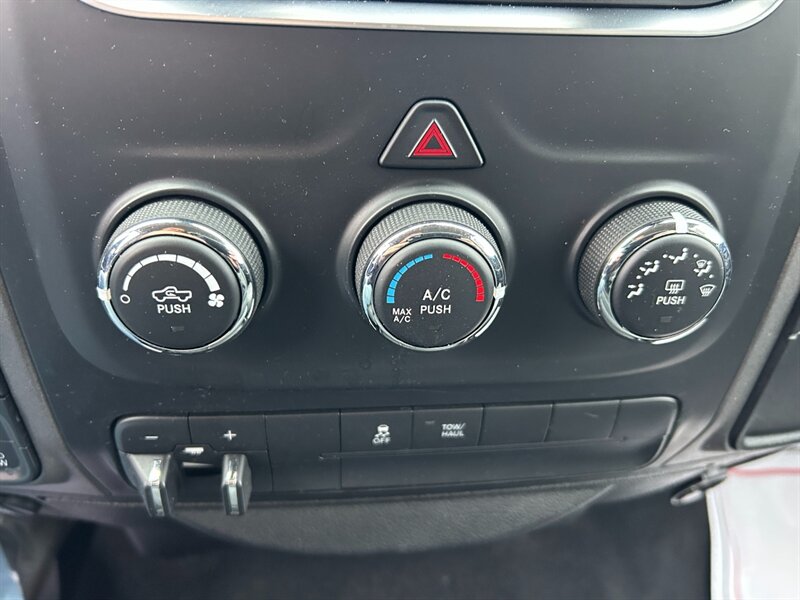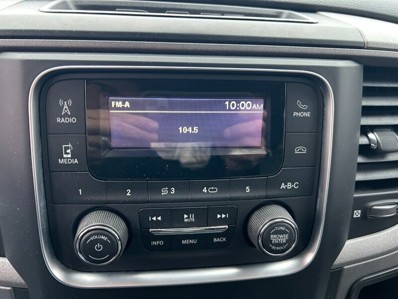 This RAM 1500 Classic comes equipped with a variety of factory default features, including a Uconnect infotainment system with a 5-inch display, Bluetooth connectivity, and a six-speaker audio system. It also features a rearview camera, vinyl seating for easy maintenance, and durable floor mats designed for heavy-duty use. The truck is equipped with 17-inch steel wheels, automatic headlights, and a locking tailgate for added security.